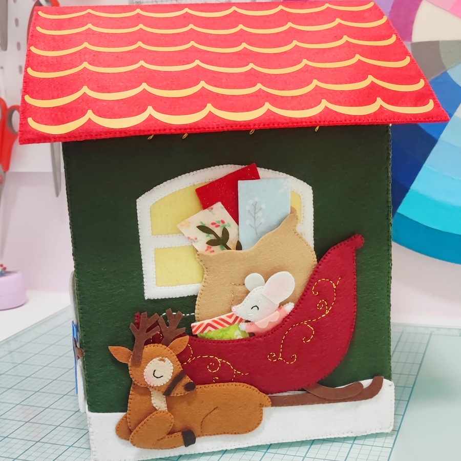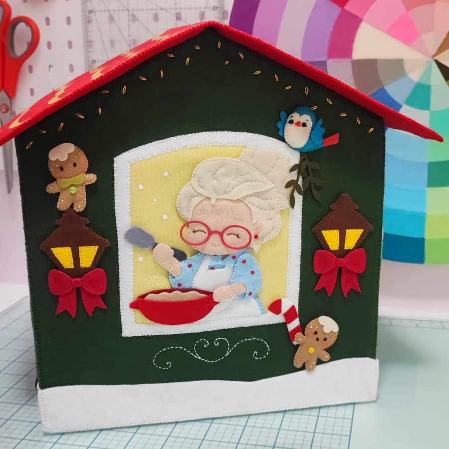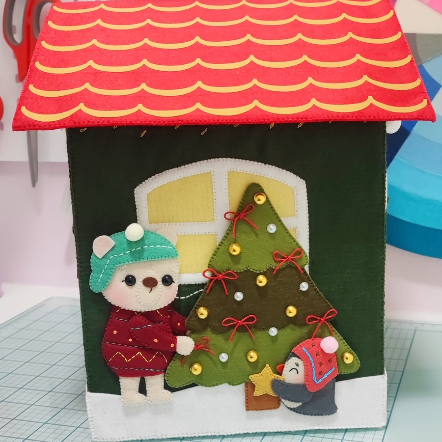 La casita mide 28 x 25 x 19 cm y está decorada completamente por los cuatro lados con personajes y elementos navideños, todos hechos a mano y con técnicas básicas de costura.